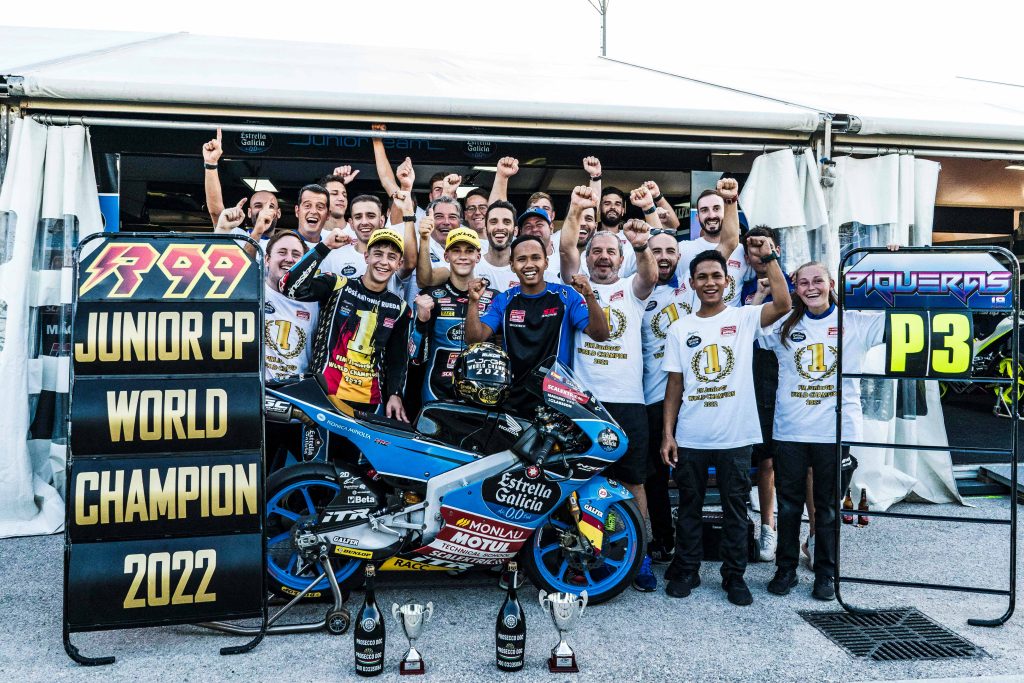 “En Monlau Motorsport estamos muy orgullosos de poder gestionar las carreras deportivas de dos grandes pilotos como son José Antonio Rueda y Ángel Piqueras, referentes que han brillado en todas las categorías de promoción y que en 2025 lograron finalizar Campeón y Subcampeón del Mundo de Moto3™, respectivamente. Un hito histórico para Monlau Motorsport del cual nos sentimos muy orgullosos de poderlo haber vivido juntamente con ellos alrededor del mundo. Fruto de ello, junto con Iban Ventura, decidimos obsequiarles con las Honda NSF250RW con las que lograron el Campeonato del Mundo Junior de Moto3™ en 2022 y 2023 con el Team Estrella Galicia 0’0”, comenta Jaime Serrano, CEO de Monlau Motorsport.